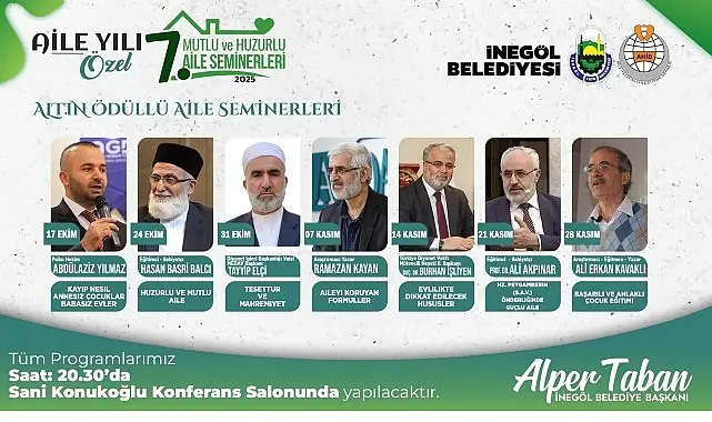 İnegöl Belediyesi’nin Aile Hayatı İyileştirme Derneği iş birliğinde düzenlediği “Aile Okulu” eğitimlerinim 7’nci dönemi başlıyor. Eğitimler 17 Ekim itibariyle 7 hafta boyunca her Cuma 20.30’da Sani Konukoğlu Konferans Salonunda yapılacak. Her hafta farklı konu ve konuklarla mutlu ve huzurlu ailenin şifreleri paylaşılacak.